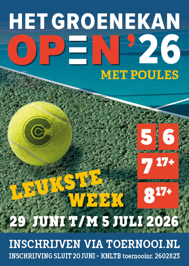 Van 29 juni t/m 5 juli 2026 wordt weer het Groenekan Open 2026 georganiseerd. Door het succes van het vorige jaar met de nieuwe week, hebben we opnieuw vanuit de tennisbond de mooiste periode van de zomer aangewezen gekregen.